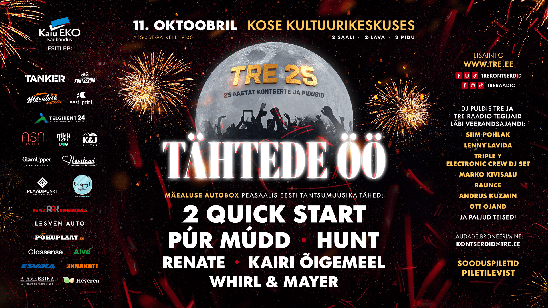 Tre pidude ja kontseride suur 25. juubelipidu 11.10.2025 Harjumaal, Kose Kultuurikeskuses. Laval 2 Quick Start, Pür Müdd, Hunt,…
